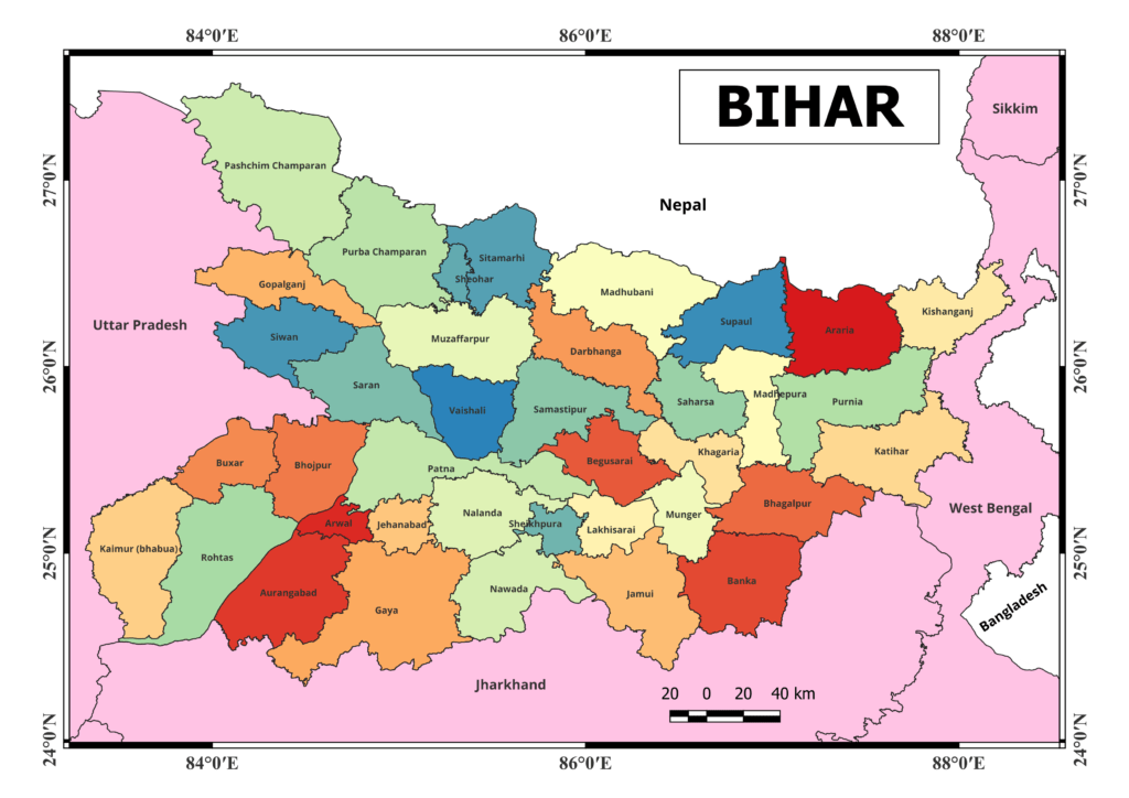बिहार की सीमाएँ Bihar Govt. Competitive Exams में सर्वाधिक बार पूछे जाने वाले विषयों में से एक हैं — उत्तर में नेपाल (अंतरराष्ट्रीय सीमा), दक्षिण में झारखण्ड, पूर्व में पश्चिम बंगाल तथा पश्चिम में उत्तर प्रदेश से बिहार की सीमा मिलती है।