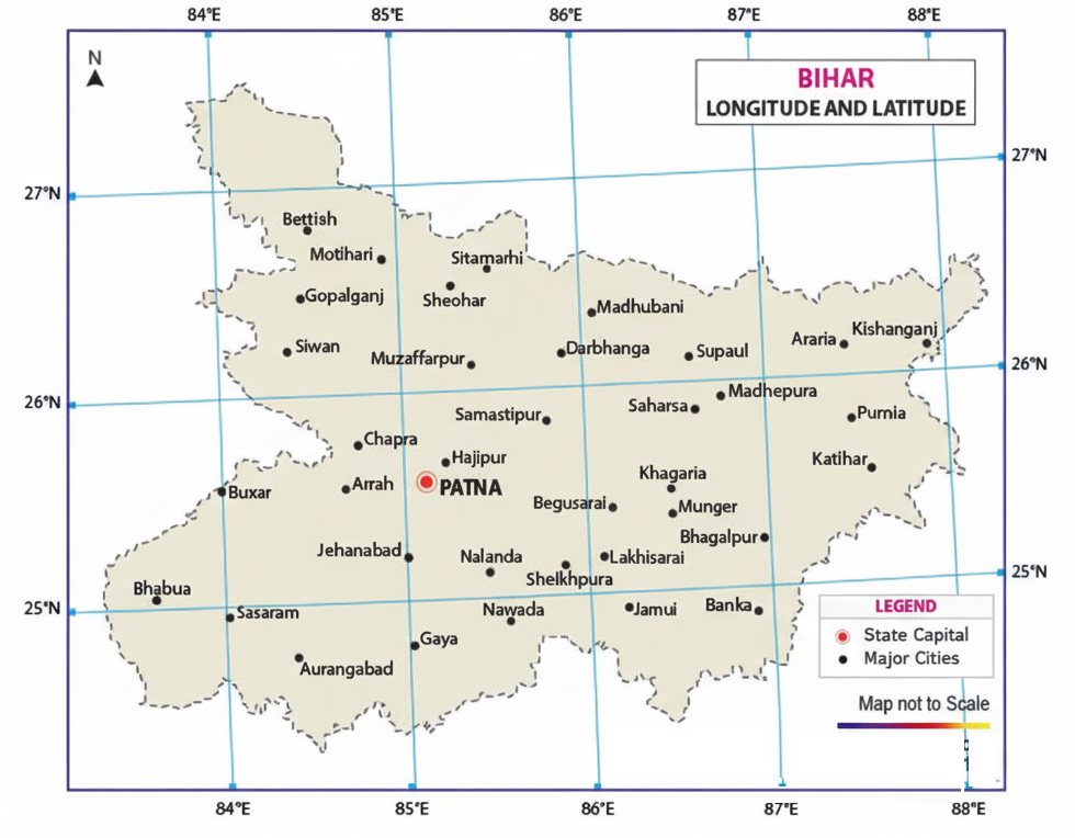 बिहार की भौगोलिक स्थिति Bihar Govt. Competitive Exams का एक अत्यंत महत्त्वपूर्ण विषय है — यह राज्य पूर्वी भारत में स्थित एक स्थलरुद्ध (landlocked) राज्य है, जो गंगा के मैदान के मध्य भाग में विस्तृत है और अपनी केंद्रीय भौगोलिक स्थिति के कारण सांस्कृतिक, ऐतिहासिक एवं आर्थिक दृष्टि से भारत का हृदय-स्थल माना जाता है।