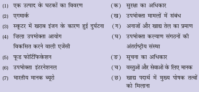उत्तर: शहद की बोतल और बिस्किट खरीदते समय मैं “एगमार्क” और “आई.एस.आई.” जैसे प्रमाण चिह्न देखूँगा।
