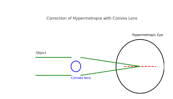 Q7. Make a diagram to show how hypermetropia is corrected. The near point of a hypermetropic eye is 1 m. What is the power of the lens required to correct this defect? Assume that the near point of the normal eye is 25 cm.