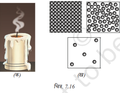 8. चित्र 7.16 (क) का अवलोकन कीजिए जिसमें एक ऐसी मोमबत्ती का चित्र है जिसे कुछ समय जलने के पश्चात बुझाया गया है। चित्र में मोम की विभिन्न अवस्थाओं को पहचानिए और चित्र 7.16 (ख) में दर्शाई गई कणों की व्यवस्था के साथ उनका मिलान कीजिए।