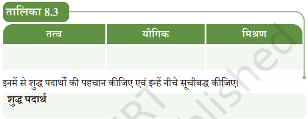 6. निम्नलिखित को तालिका 8.3 में तत्वों, यौगिकों या मिश्रणों के रूप में वर्गीकृत कीजिए। कार्बन डाइऑक्साइड, रेत, समुद्री जल, मैग्नीशियम ऑक्साइड, गदला जल, ऐलुमिनियम, सोना, ऑक्सीजन, जंग, आयरन सल्फाइड, ग्लूकोस, वायु, जल, फलों का रस, नाइट्रोजन, सोडियम क्लोराइड, सल्फर, हाइड्रोजन, बेकिंग सोडा।