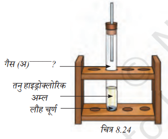 उत्तर: चित्र 8.24 में लौह चूर्ण (Iron powder) को तनु हाइड्रोक्लोरिक अम्ल (Dilute Hydrochloric Acid) के साथ अभिक्रिया कराई जा रही है। इस अभिक्रिया से हाइड्रोजन गैस निकलती है।