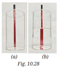 12. Place a pencil behind a transparent glass tumbler (Fig. 10.28a). Now fill the tumbler halfway with water (Fig. 10.28b). How does the pencil appear when viewed through the water? Explain why its shape appears changed.