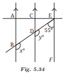 5. In Fig. 5.34, AB is parallel to CD and CD is parallel to EF. Also, EA is perpendicular to AB. If ∠BEF = 55°, find the values of x and y.