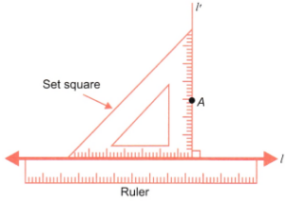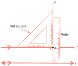 Step 2: Slide a set square along the line l, so that its perpendicular side touches the point A. Draw a line l’ through A = as shown in the Figure.