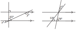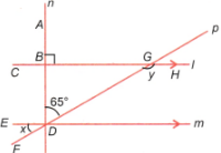 We have ∠ABG = 90°, ∠BDG = 65°, ∠EDF = x and ∠DGH = y.