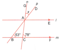 We have ∠GAD = x, ∠ABC = 53°, and ∠ACF = 78°.