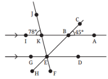 4. In Fig. 5.33, ∠ABC = 45° and ∠IKJ = 78°. Find angles ∠GEH, ∠HEF, ∠FED