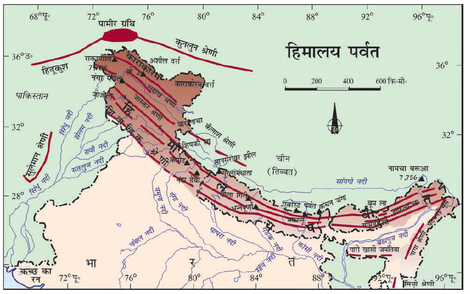 - हिमालय एक नवीन वलित पर्वत श्रृंखला है, जिसमें ऊँचे शिखर, गहरी घाटियाँ और तेज बहने वाली नदियाँ पाई जाती हैं।