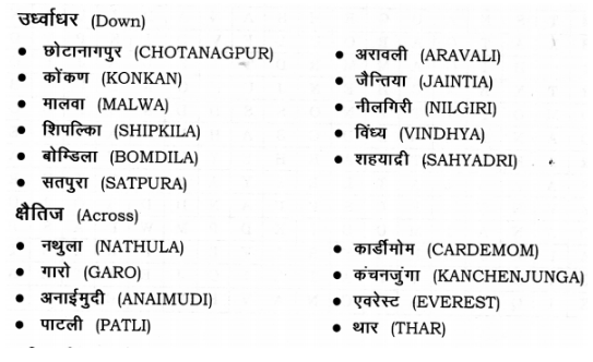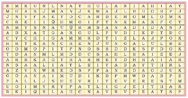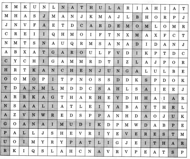- दी गई वर्ग पहेली में कुछ शिखरों, दरों, श्रेणियों, पठारों, पहाड़ियाँ एवं घाटियों के नाम छुपे हैं। उन्हें ढूंढिए।
