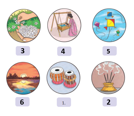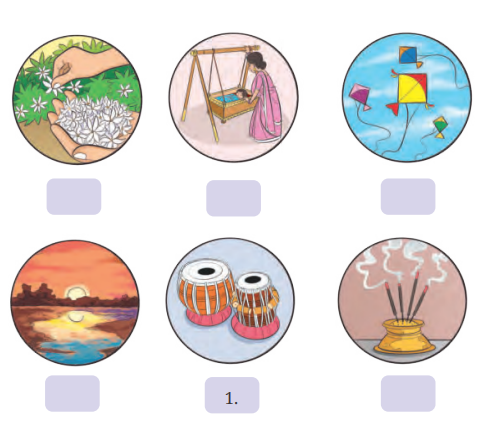 III. Write numbers against each picture with the phrases that describe them with their sensorial associations.