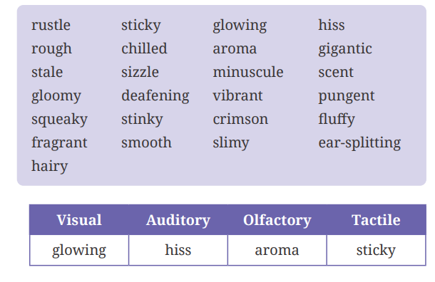 I. Work in pairs to classify the sensory words given in the box below. One example has been done for you.