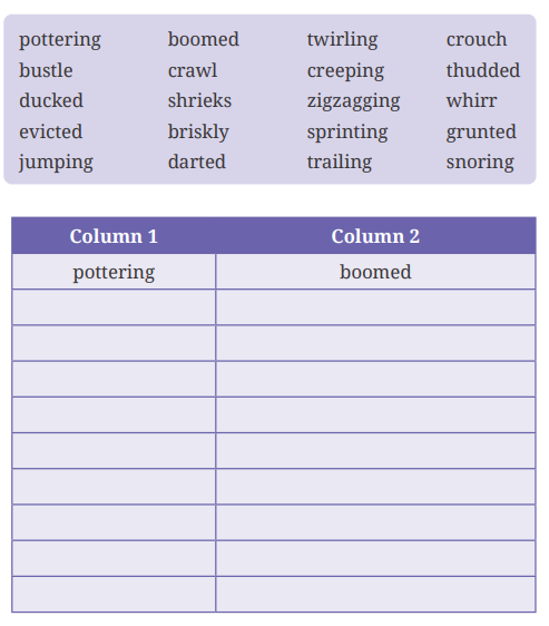 I. Classify the words given in the box on the next page into movement words in Column 1 and sound words in Column 2. One example has been done for you.