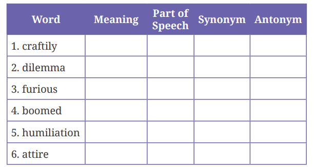 | Word | Meaning | Part of Speech | Synonym | Antonym |