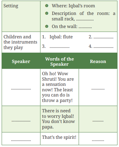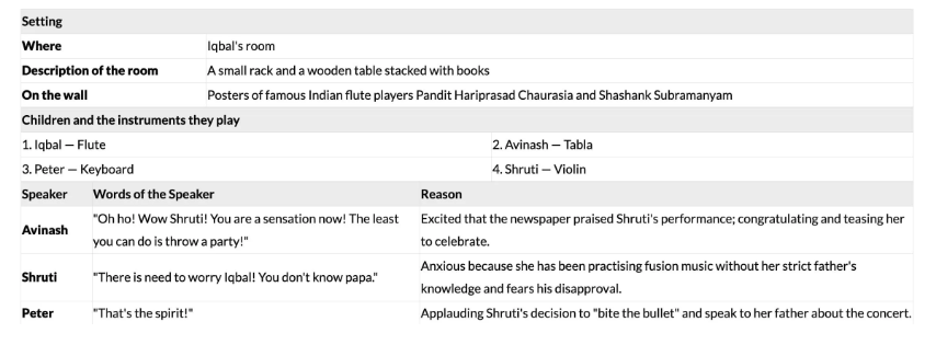 1. Shruti: There is need to worry Iqbal! You don’t know papa. He is very strict about these things. He will think it a desecration of the violin to be played to Western tunes. Papa firmly believes that Classical Hindustani music, with its ragas and aalaaps, is the only kind of music that an artist of any worth should play. I don’t want papa to feel that I don’t care about his opinions, because I do. It’s just that I want to give this a try too. I just don’t know how to tell him in the right way!