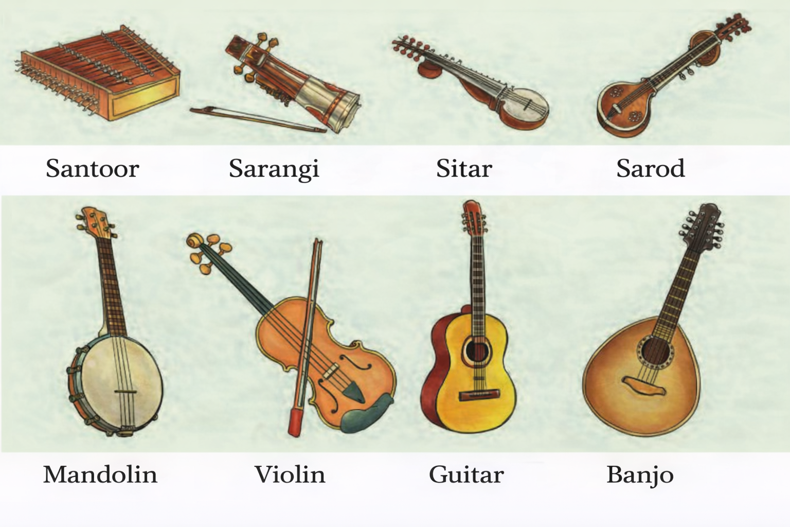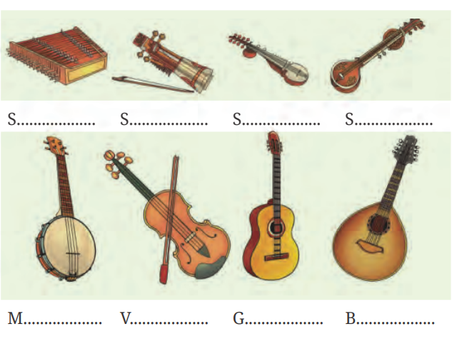 Q I.Given below are some stringed musical instruments. Work in pairs and identify them by first letter of the spellings of their names.
