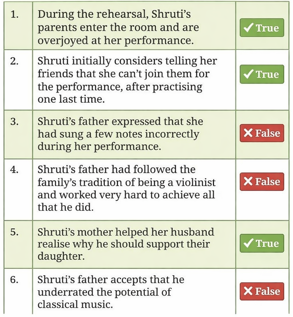 Answer: Shruti’s internal conflict shows her struggle between respecting her father’s wishes and following her own passion for fusion music. She does not want to hurt her father but also wants to try something new. This highlights the conflict between family duty and personal dreams, which is resolved when her father understands her.