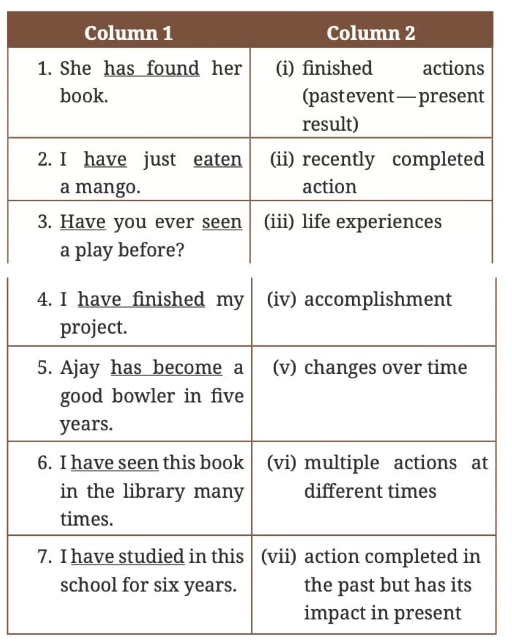 | 7. I have studied in this school for six years. | (vii) action completed in the past but has its impact in present |