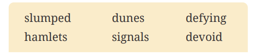 We stepped out of the vehicle at the end of the road. Immediately, our body sent 1. signals that our decision to visit the sand 2. dunes in the afternoon was insane. We had passed a few 3. hamlets on our way to the desert. We could not find even a single soul outdoors, 4. defying the blazing sun. Even the camels were 5. slumped in the little shade offered by the khejri trees. In this remote place people relied on Bharat Sanchar Nigam Limited (BSNL) to connect to the world as the area was 6. devoid of any other network service.