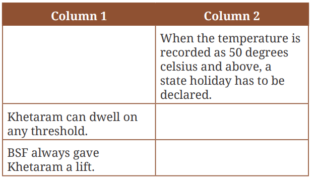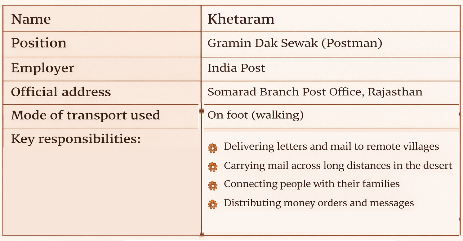 | BSF always gave Khetaram a lift. | Because BSF soldiers helped him travel long distances easily in the desert while carrying mail. |