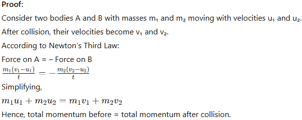 Answer: The law of conservation of momentum states that when no external force acts on a system of interacting bodies, the total momentum remains constant.