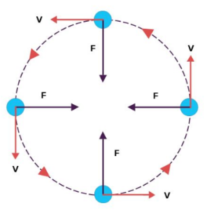 - Speed remains constant, but direction changes continuously.