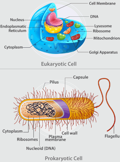 | 5. Cell Organelles | Membrane-bound organelles absent. (No ER, Golgi body, mitochondria, etc.) | Membrane-bound organelles present. (ER, Golgi apparatus, mitochondria, lysosomes, plastids, etc.) |