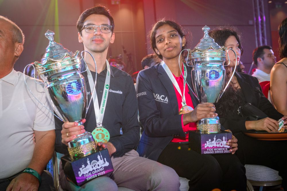 उज़्बेकिस्तान के समरकंद में 4-15 सितंबर तक आयोजित 2025 FIDE ग्रैंड स्विस और महिला ग्रैंड स्विस में, ग्रैंडमास्टर अनीश गिरि और ग्रैंडमास्टर वैशाली रमेशबाबू चैंपियन बनकर उभरे। उनकी जीत ने न केवल उन्हें ट्रॉफी और शीर्ष पुरस्कार राशि दिलाई, बल्कि प्रतिष्ठित 2026 कैंडिडेट्स टूर्नामेंट के लिए भी क्वालीफाई कराया, जो विश्व शतरंज चैंपियनशिप के अगले दावेदारों का निर्धारण करते हैं।