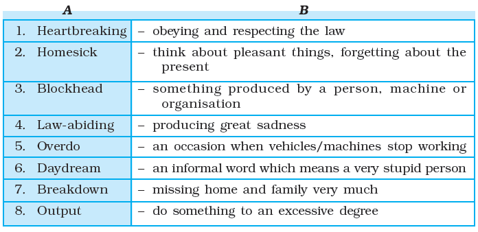 Question 1. Match the compound words under A with their meanings under ‘B’. Use each in a sentence.
