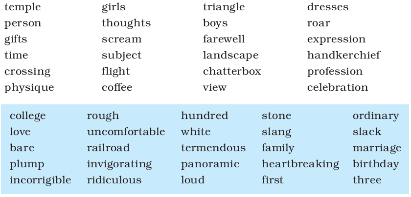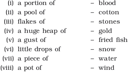 2. Given below are some nouns, and a set of modifiers (in the box). Combine the nouns and modifiers to make as many appropriate phrases as you can. (Hint: The nouns and modifiers are all from the texts in this book.)