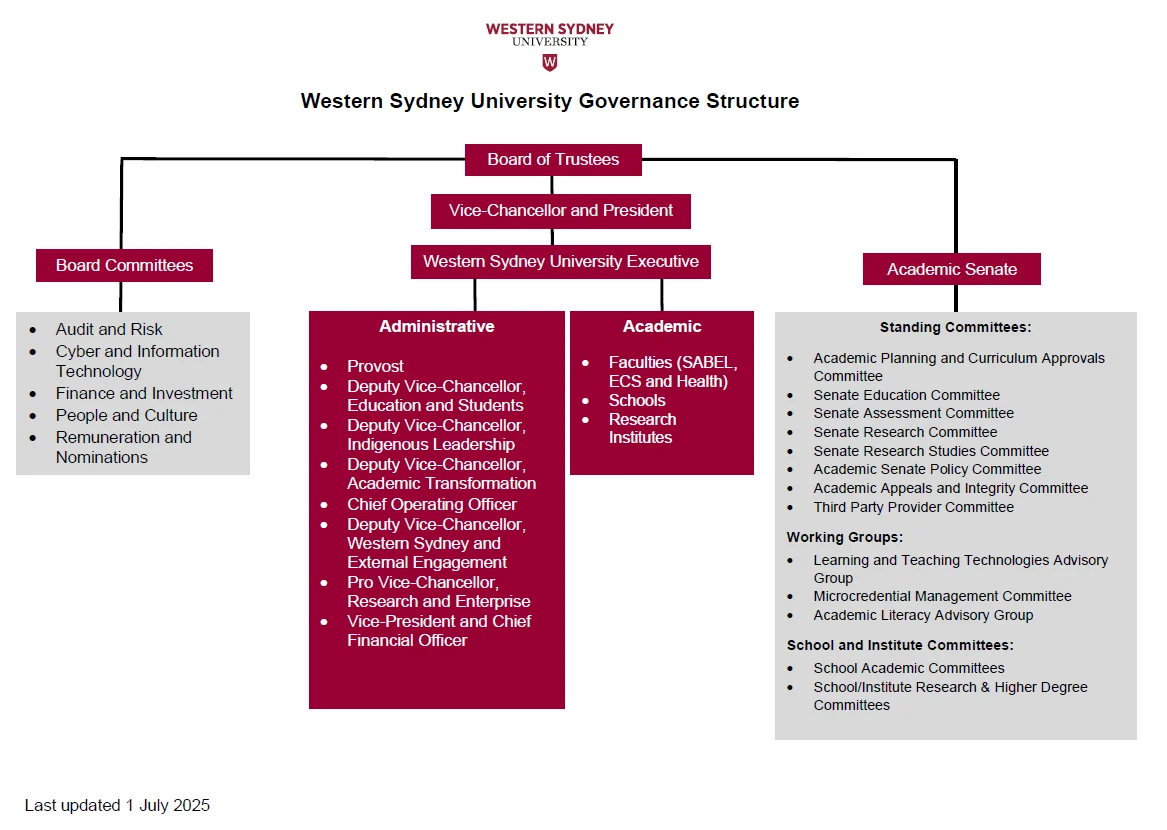 The Chancellor is the Chair of the Board of Trustees, the peak governing body of the University.